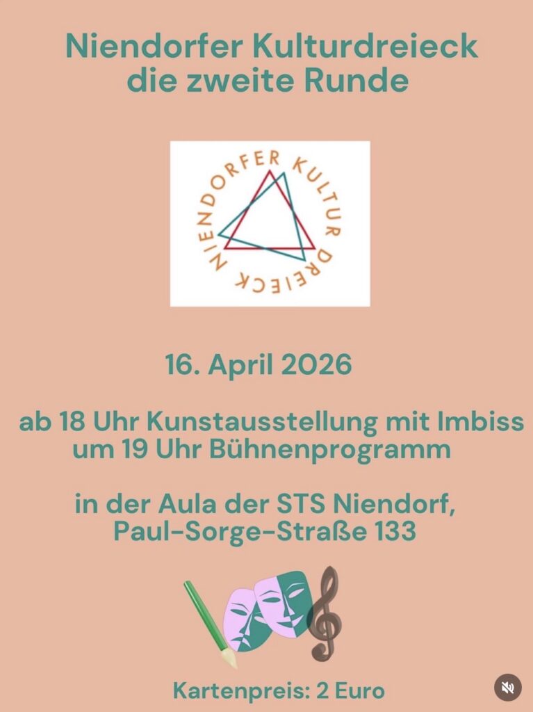 Wir laden ein zur 4. Auflage des Niendorfer Kulturdreiecks. Das Kulturformat der drei weiterführenden Niendorfer Schulen (Gymnasium Bondenwald, Gymnasium Ohmoor, STS Niendorf) wird wieder abwechslungsreich: Nach der Kunstvernissage (ab 18 Uhr) beginnt um 19 Uhr das Kulturprogramm mit Theater und Musik in der Aula. Karten können im Sekretariat der STS Niendorf gekauft und/oder vorbestellt werden.