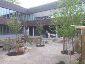 Im Rahmen mehrerer Aktionstage an beiden Standorten haben zahlreiche Mitglieder unserer Schulgemeinschaft dabei geholfen, unser Schulgelände strukturreicher, attraktiver und naturnäher zu gestalten. Dabei sind u.a. das Hühnergehege, ein Blühstreifen, eine Kräuterspirale und etliche zusätzliche Sitzgelegenheiten für unsere Schüler_innen entstanden. Dadurch ist nicht nur Schulgelände zu einem (noch) lebenswerteren Ort geworden, sondern es haben alle Beteiligten das Gefühl gehabt, etwas Wertvolles und Erhaltenswertes zu schaffen. Dies zeigt sich auch daran, dass alle Maßnahmen bislang von jeder Form von Vandalismus verschont geblieben sind, so dass sich alle tagtäglich daran erfreuen können.